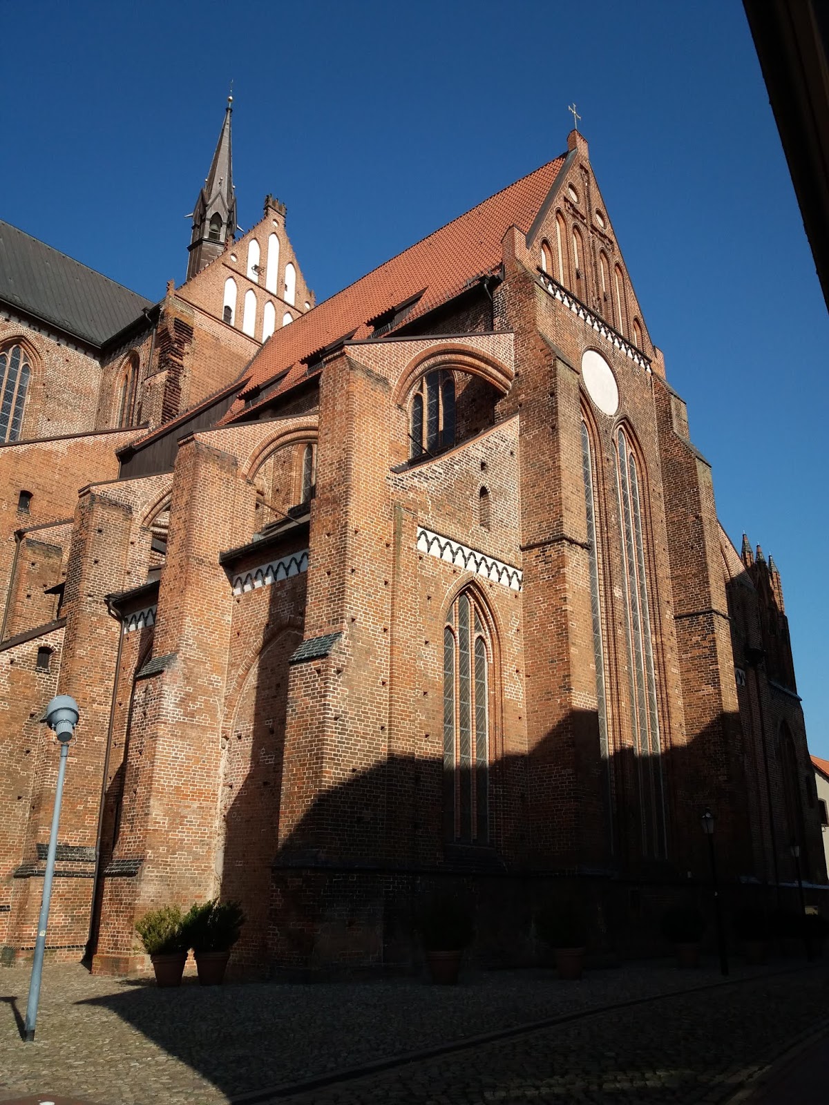 Reggeli után, 9-kor elindultunk várost nézni Wismarban. A város területét eredetileg szlávok lakták, 1147-ben említik először a nevét, 1229-ben már városi rangot kapott. 1259-ben szövetséget kötött Rostock és Lübeck városokkal, ebből alakult meg később a Hanza-szövetség. A 30 éves háború után svéd fennhatóság alá került, csak 1903-ban került véglegesen Mecklenburghoz. Óvárosa a világörökség része. Itt született a híres kalózvezér, Klaus Störtebecker. Volt egy térképünk, amin sorra vették a látnivalókat, A-tól X-ig, eszerint mentünk végig az ajánlott útvonalon. Először elsétáltunk a Welt-Erbe-Haus-hoz, ahol Wismar története mellett egy világörökségi kiállítást is láthattunk … volna, de sajnos csak 10-kor nyitott, így ezt a programot eltettük későbbre. (Végül annyi szép helyet láttunk Wismarban, hogy nem jöttünk vissza a múzeumba.) Innen a Marienkirche megmaradt tornyához mentünk. A templom a második világháborúban súlyosan megsérült, a 60-as években pedig felrobbantották, így ma már csak egyetlen (bár óriási) tornyot lehet látni belőle. A felrobbantás ellen hiába tiltakoztak a helyiek, a torony is csak azért maradhatott meg, mert hajózási tájékozódási pontként szolgál. A templom helyén egy érdekes szabadtéri galériát rendeznek be (úgy láttuk, még folynak a munkálatok), először is megjelölték a templom egykori alaprajzát, valamint láttunk néhány kisebb szobrot is. 1951-ben felépítették a Neue Kirche-t, vagyis az új templomot, ahol összegyűlhettek a hívek. Néhány méterre innen áll az Archidiakonat, vagyis a főesperesi hivatal és lakóház, egy gyönyörű gótikus téglaépület, szépen tagolt homlokzattal. A ház a legújabb kutatások szerint a 15. század elején épült, de a második világháborúban ez is megsérült. Szerencsére a 60-as években nem felrobbantották, mint a templomot, hanem restaurálták. Innen a Fürstenhof-hoz mentünk, ami a mecklenburgi hercegek nyári rezidenciája volt. A palota tulajdonképpen két részből áll, a későgótikus stílusú „Altes Haus” 1513-ban, az olasz reneszánsz stílusú „Neues Haus” pedig 1555-ben. Ma bíróság működik benne. Bementünk a belső udvarba, innen is megcsodáltuk a szép faragásokat az ablakok körül. Néhány méterre áll a St.-Georgen-Kirche, Wismar három főtemplomának egyike. A monumentális templom gyakorlatilag teljesen üres, a berendezése vagy tönkrement a 2. világháborús bombázások során, vagy más templomokba menekítették. Jelenleg próbálják újra berendezni, egy alapítvány pénzt gyűjt az orgona felújítására, a főoltárt és más tárgyakat pedig Wismar templomaiban helyezték el. Jelenleg kulturális központként hasznosítják, koncerteket, kiállításokat, színházi előadásokat tartanak benne. Ezután gyönyörű, régi házak között sétálva megkerestük a Zeughaus-t, ami egykor a svéd helyőrség fegyverraktára volt. Az eredeti épület egy óriási robbanás következtében 1699-ben megsemmisült, a mai épület 1700-ban épült, ma a városi könyvtár működik benne. Ezután a Heiligen-Geist-Kirche-hez mentünk. Az egyszerű, egyhajós templom a 14. század elején épült, egyszerre szolgált templomként, kórházként valamint szállásként zarándokok és hajléktalanok számára. Megcsodáltuk a gyönyörű üvegablakokat, és a különleges, fagerendákból álló mennyezetet. Lefényképeztük a templomudvarba vezető bejáratot, ami egy itt forgatott tévésorozatban is szerepet játszik. Ezután lesétáltunk a kikötő közelében álló Lohberg-re. Ez (nevével ellentétben) nem hegy, hanem egy festői kis tér (vagy inkább utca), ahol a favázas egykori raktárházakban kávézók, éttermek találhatók, az egyik legrégebbi ház egy sörfőzde, ami 1452 óta működik! Ezután sétáltunk a gyönyörű napfényben a kikötőben, a part mentén kis halászhajók ringatóztak, amelyekről frissen fogott halat és abból készült fogásokat árultak. Végigsétáltunk a mólón, egészen a Baumhaus-ig, ahol a kikötő-igazgatóság dolgozói laktak, akik éjjelre vagy veszély esetén lezárták a kikötőt. A bejáratot két svéd katona feje őrzi. A kikötő és a város között áll a Wassertor, ami a városfal 5 kapujából az egyetlen, ami a mai napig megmaradt. 1450-ben épült, érdekes, hogy a két oldala különbözik. Végigsétáltunk a Scheuerstraße-n, ahol gyönyörű homlokzatú gótikus, barokk és klasszicista stílusban épült házakat fényképeztünk. Ezután végigsétáltunk a Grube mentén. Ez egy mesterséges vízfolyás, amit a 13. század közepén egy patakmederben létesítettek, ezzel Németország legrégebbi városi vízfolyása! Malomkereket hajtott, tűzoltásra és szállításra használták, valamint biztosította a város vízellátását. A Grube mentén a St.-Nikolai-Kirche-hez mentünk, ami egykor a hajósok és halászok temploma volt. 1381 és 1487 között épült, a késő gótikus stílusú templom a 18. század végén barokk berendezést kapott, és Németország 4. legmagasabb templomhajója címmel büszkélkedhet. Érdekes volt, hogy az egyik oldalkápolnában egy könyvbazárt láttunk. A templommal szemben, a Grube túloldalán áll a Schabbelhaus, amit 1571-ben építtetett Heinrich Schabbell, Wismar későbbi polgármestere. A ház a Balti-tenger térségének legkorábbi reneszánsz épületeinek egyike, jelenleg a várostörténeti múzeum otthona. Ezután átsétáltunk a Lindengartenbe, amit az egykori svéd citadella helyén létesítettek 1815-ben. A park szélén áll a Wasserturm, ami egykor a középkori városerőd része volt, majd később a vízellátást szolgálta. A park egyébként nagyon bájos, sétányok, padok, mindenütt, szomorúfűzfák állnak a Grube partján, ami keresztülfolyik rajta. Ezután megkerestük a főt